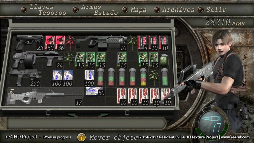 The inventory system features a grid system by an attache case, that has each item take up a certain number of spaces. Throughout the game, the case can be updated many times. Weapons, ammunition, and healing items are kept in the case, while key items and treasures are kept in the menu. First aid sprays, weapons, allows for weapons to be upgraded and buys various treasures that Leon can find. The various that’s found throughout the game all have their advantages and disadvantages.
